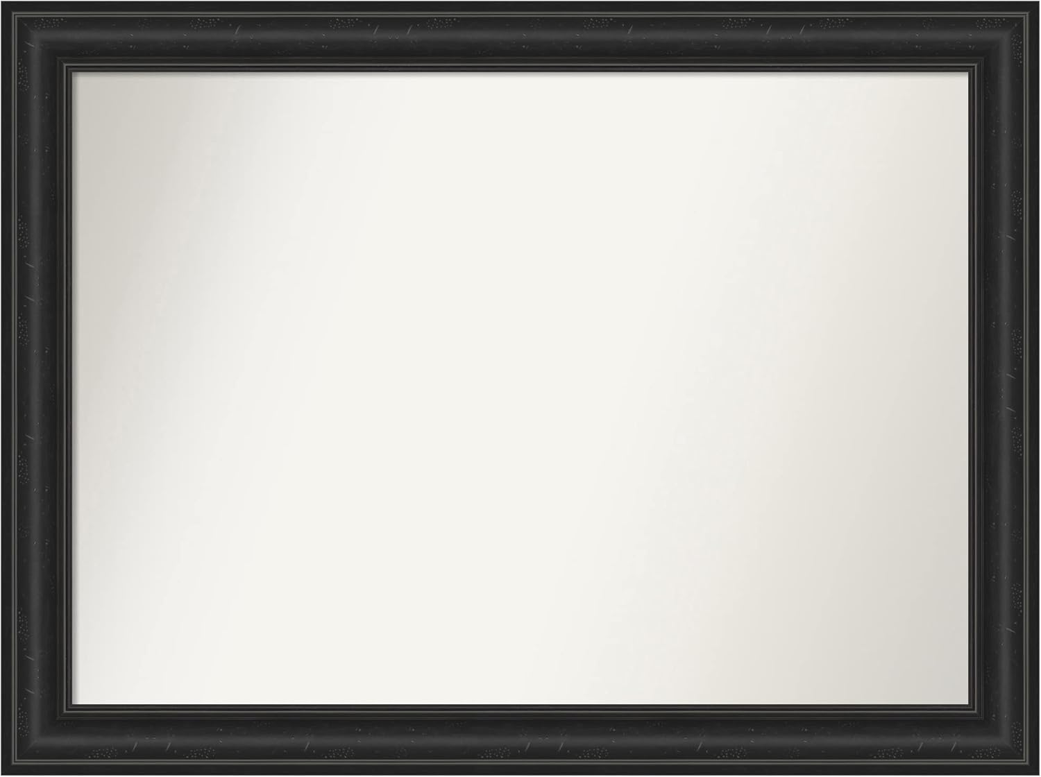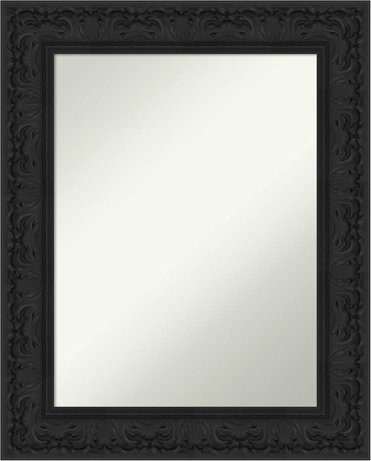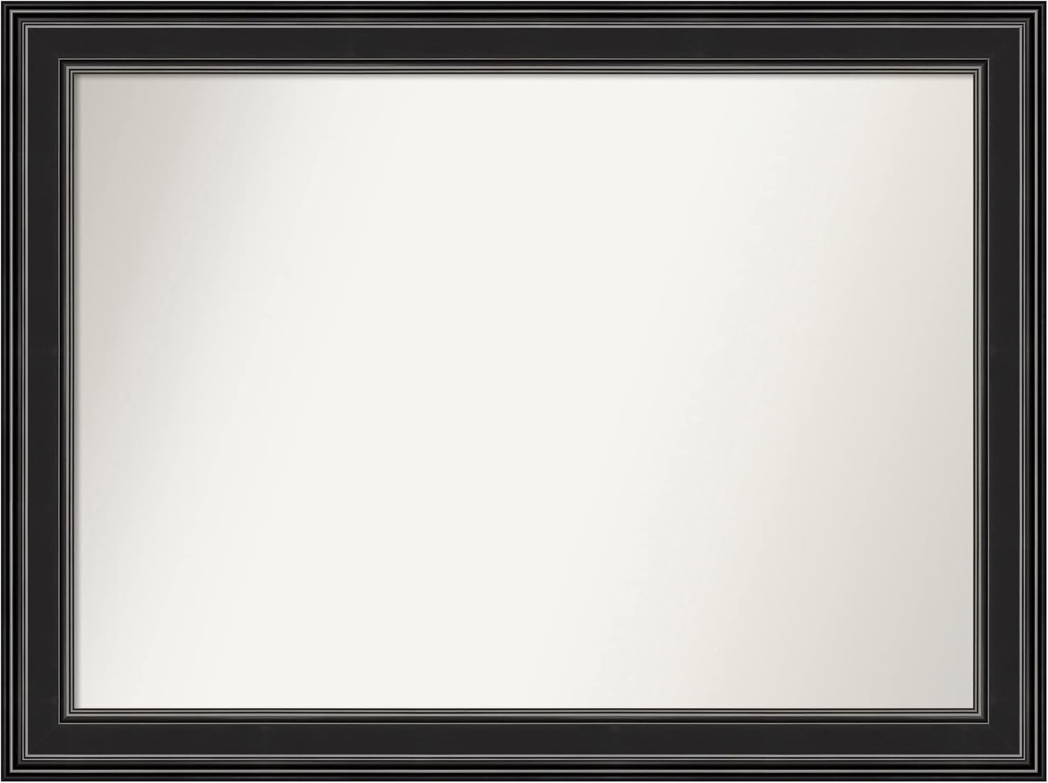 PRODUCT: Amanti Art Non-Beveled Bathroom Wall Mirror; OUTER SIZE: 24 x 30 inches; FRAME: Colonial Black 3"; FRAME FINISH: Satin; FRAME COLOR: Black. The Colonial Black frame features a classic black frame with satin finish and a deep scooped profile with a slight step. The outside edge features a scalloped profile. Give your bathroom the finishing touch with this framed wall mirror. Individually made using traditional custom framing techniques, it has the quality you would expect from your local frame shop. It holds its value with premium finishing that can be appreciated up close. Because of our attention to detail and focus on artistry, architects, interior designers, and homeowners alike choose this mirror to create beautiful living spaces.